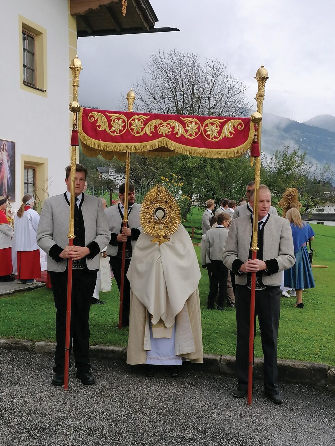 Wegen des unsicheren Wetters wurde die Liturgie bei den Altären etwas verkürzt abgehalten. Kooperator James erteilte viermal den eucharistischen Segen an die vielen Gläubigen.