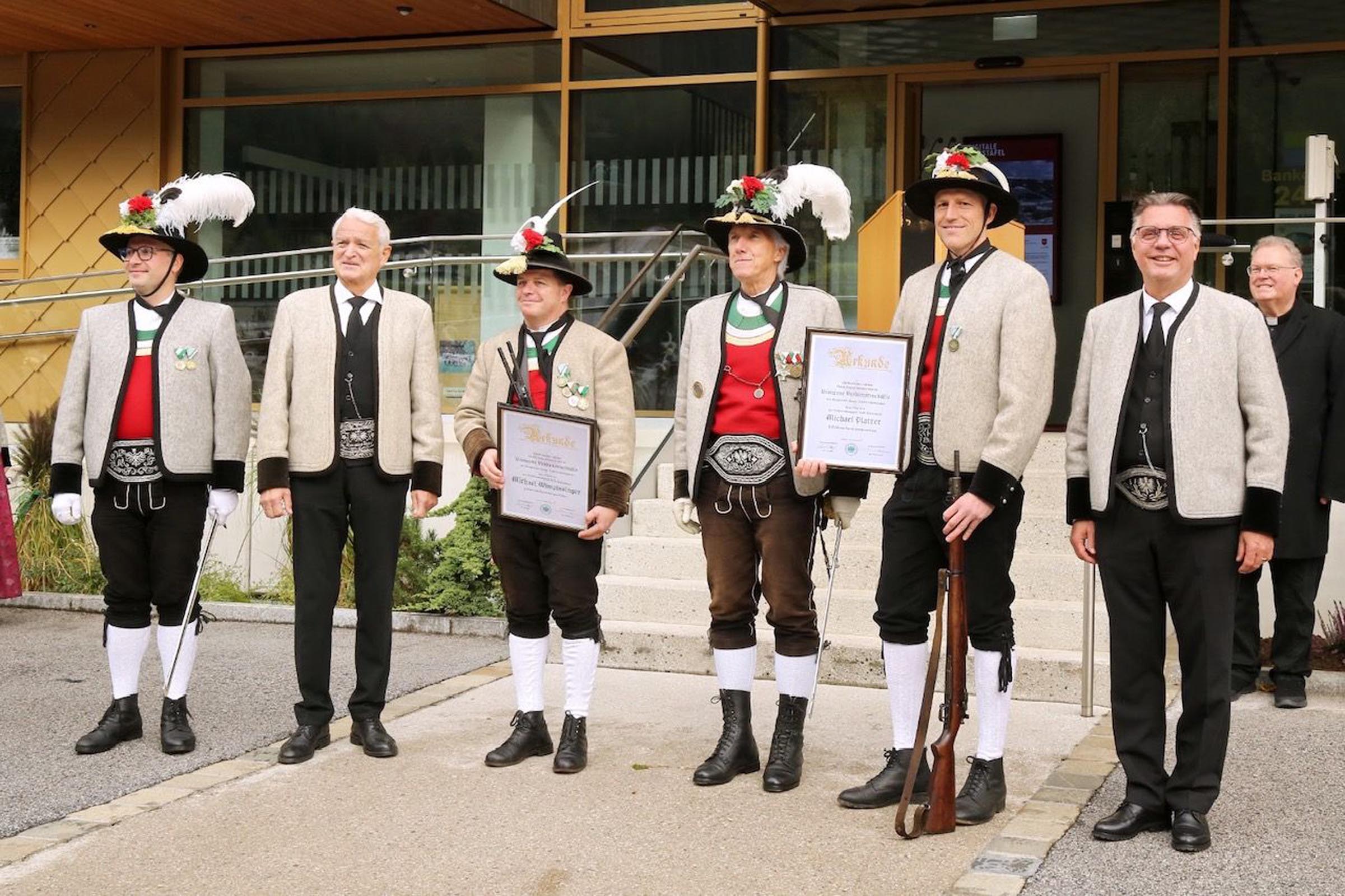 Ein Höhepunkt des Festes war die Auszeichnung zweier verdienter Schützenkameraden: Michael Wimpissinger (Hotel Platzlhof) und Michael Platzer (Hotel Hochzillertal – Liebstöckl) wurden für ihr langjähriges und außerordentliches Wirken zum Wohle der Kompanie sowie des gesamten Tiroler Schützenwesens mit der „Bronzenen Verdienstmedaille des BTSK“ geehrt. Auch ihnen wurde mit einer Ehrensalve der Respekt und die Dankbarkeit der Gemeinschaft erwiesen.