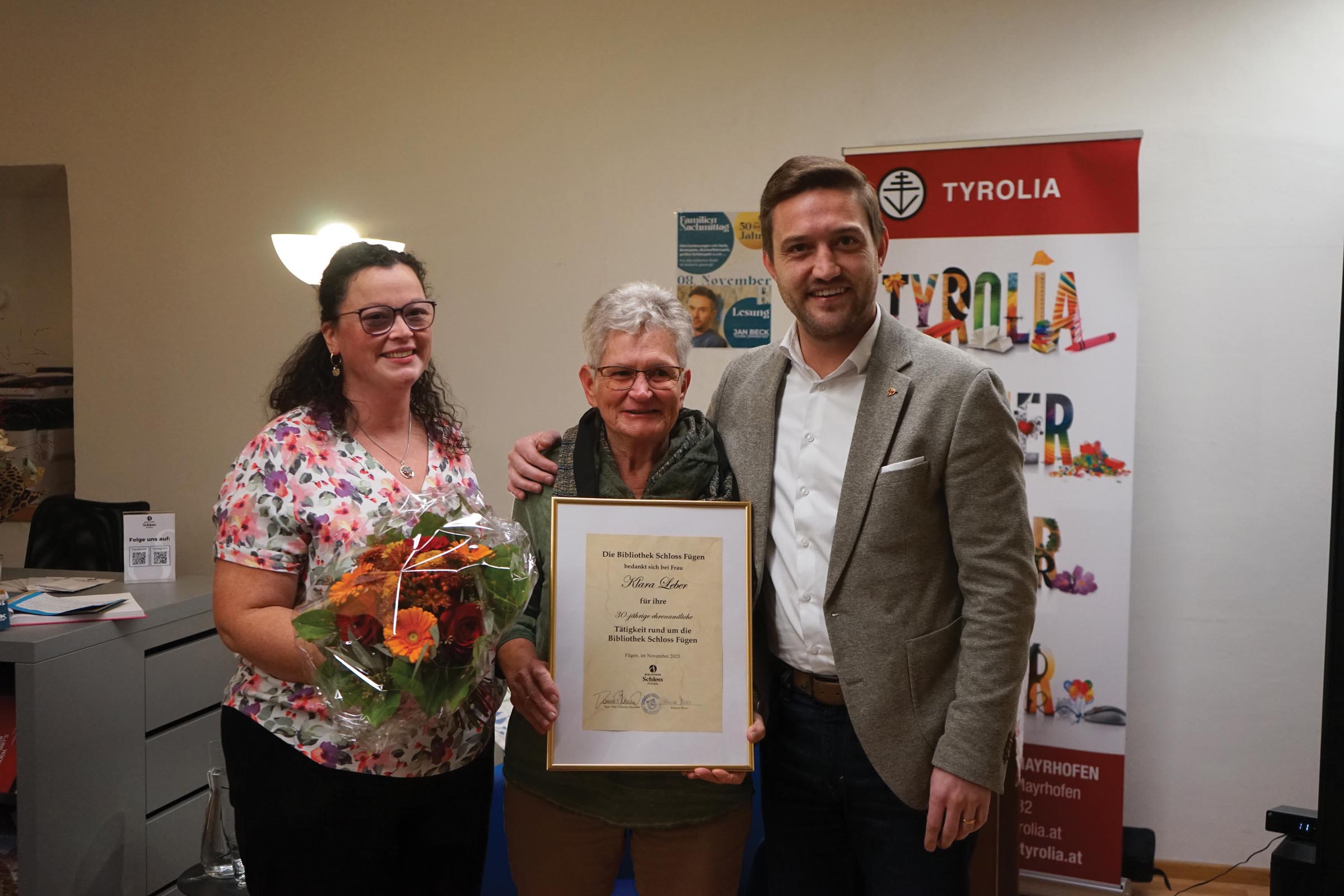 Als die Räumlichkeiten im Widum aufgrund der stetigen Erweiterung des Bücherbestandes zu klein wurden, zog die Bibliothek 2022 ins Schloss Fügen – und erstrahlt dort seither mit rund 9.200 Medien und über 1.100 LeserInnen in neuem Glanz. Seit 2024 führt Rebecca Moser die Bibliothek Schloss Fügen, unterstützt von Helga Windisch und 14 engagierten Mitarbeiterinnen. Gemeinsam gestalten sie einen Ort voller Geschichten, Begegnungen und Lesefreude – damals wie heute.