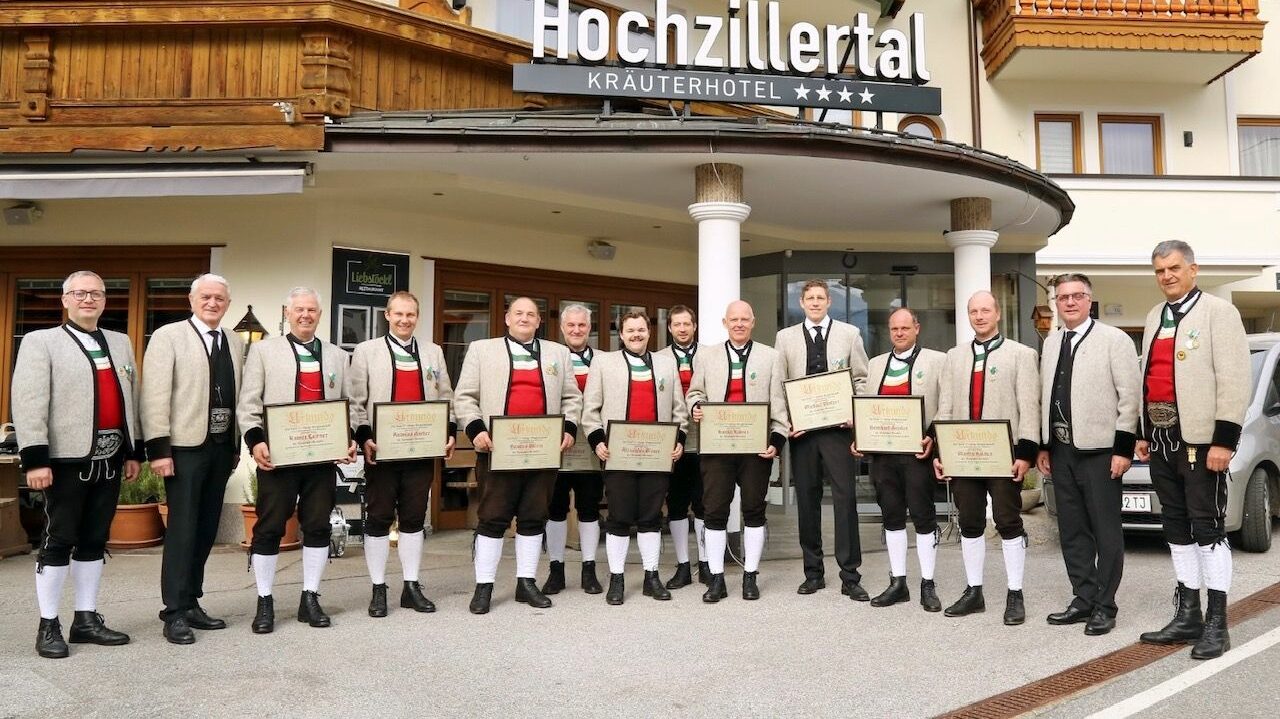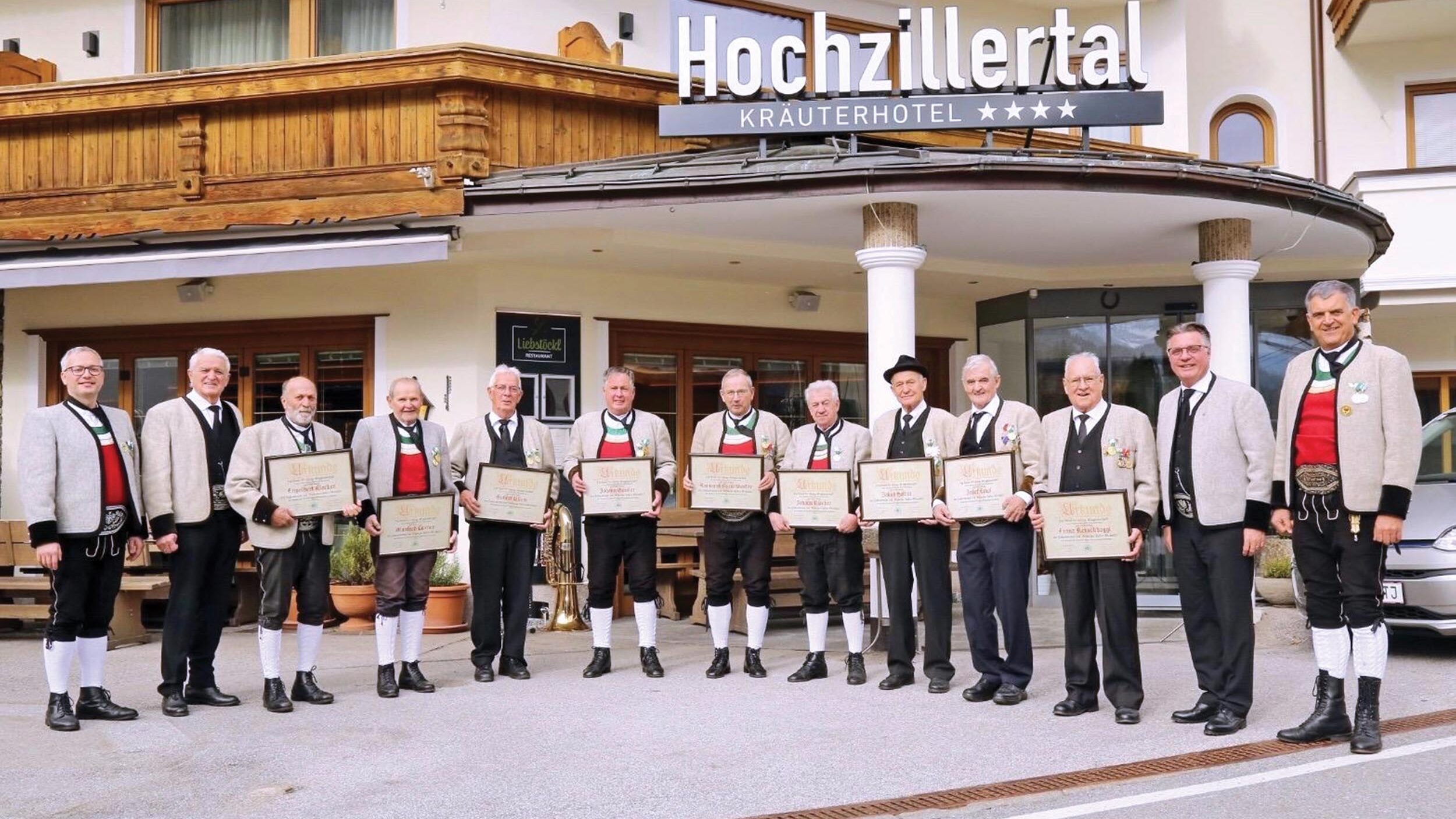Nach der heiligen Messe, feierlichst zelebriert von HW Herrn Pfarrer Mag. Tobias Höck und beeindruckend musikalisch umrahmt von der Bundesmusikkapelle Ried-Kaltenbach, sowie der Angelobung der neuen Marketenderinnen und Schützenkameraden, der Kranzniederlegung am Kriegerdenkmal, gewürdigt durch eine Ehrensalve für die Gefallenen beider Weltkriege und der verstorbenen Schützenkameraden, marschierte eine schneidige, starke Kompanie zum Kräuterhotel Hochzillertal/Liebstöckl.