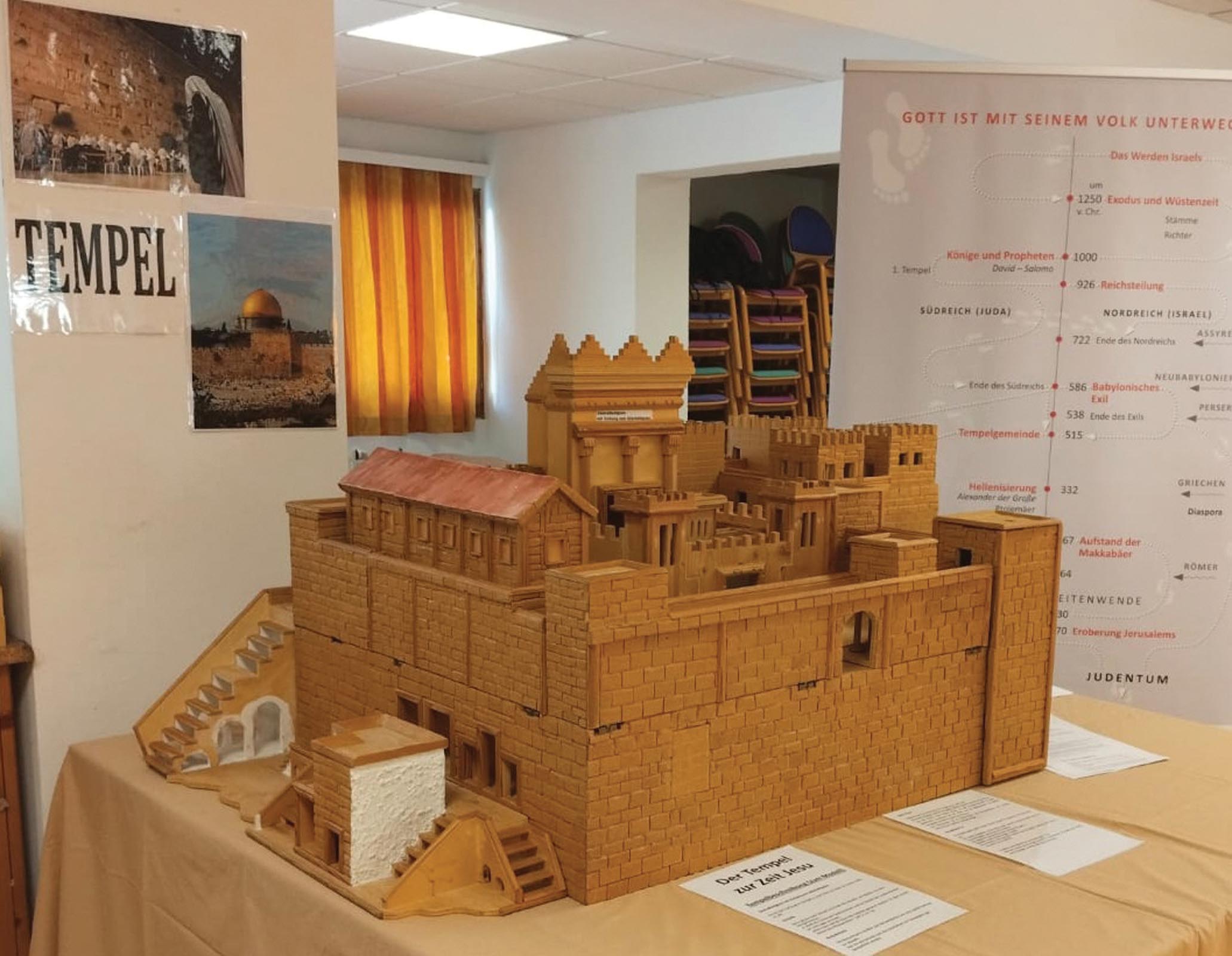 In sehr kurzweiligen Führungen wurden die einzelnen Stationen mit viel Wissenswertem erklärt. Unter anderem wurde der Aufbau der Bibel ausgelegt, die Besucher konnten auch einen Gebetsschal und eine „Kippa“ anprobieren (aus der jüdischen Tradition), es wurde der Aufbau des Jerusalemer Tempels erklärt, verschiedene Stationen aus dem Leben zur Zeit Jesu und von seinem Wirken wurden den Besuchern nahegebracht. Auch die „Rose von Jericho“ faszinierte immer wieder. Ebenso bestand die Möglichkeit, verschiedene Lebensmittel, Obst, Apfelbrot und Gewürze, die für den Lebensraum der damaligen Zeit typisch waren, zu verkosten. Außerdem konnten sich die Besucher der Ausstellung noch am „Gebetssalat“ versuchen und die richtige Zusammenstellung von verschiedenen Gebeten ausprobieren. Für die Schulklassen gab es zusätzlich noch ein Quiz bzw. ein Rätsel, verschiedene Malvorlagen und das Rezept für einen „Bibelkuchen“ zum Mitnehmen.