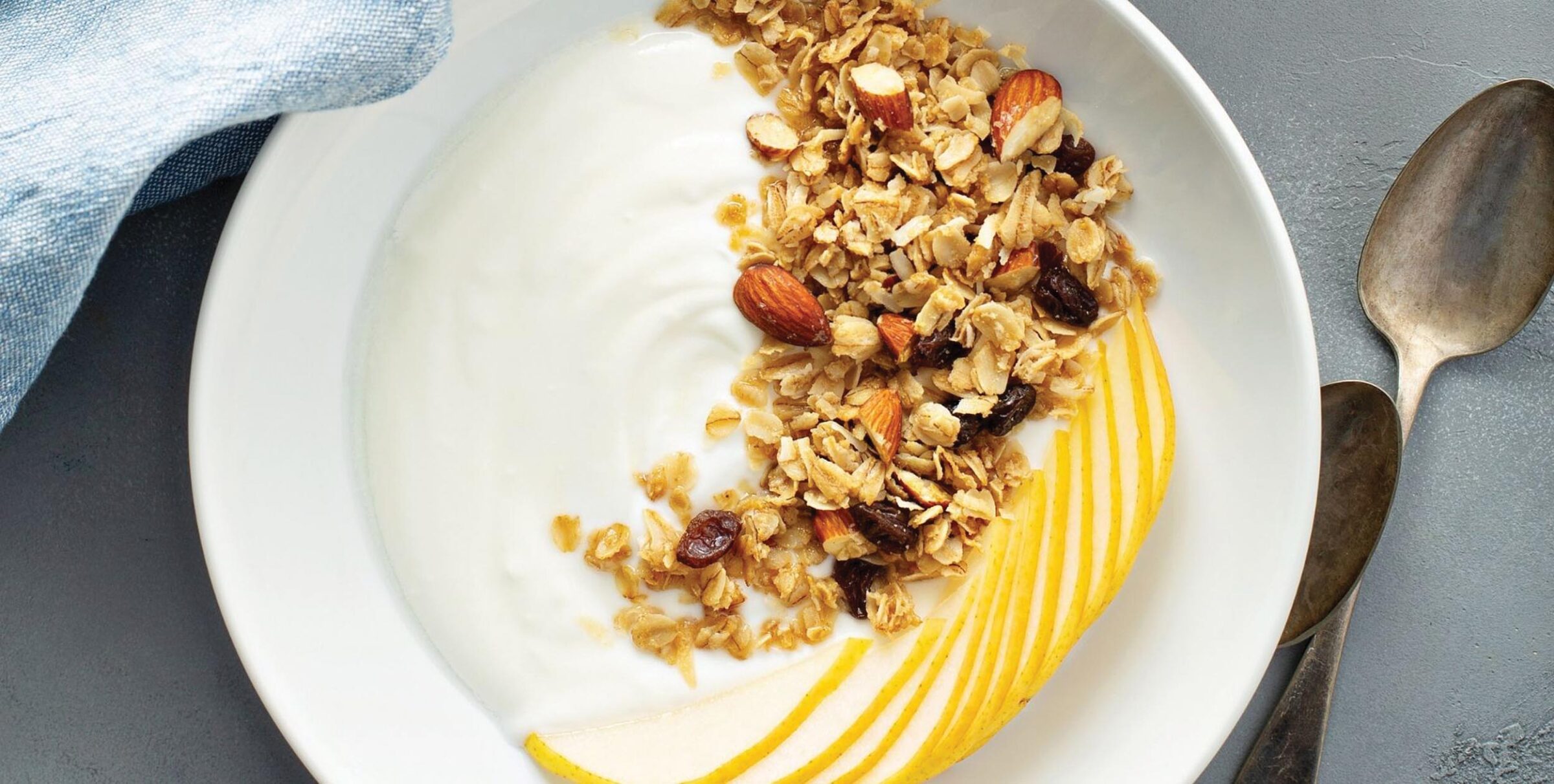 Das brauchst Du: Leichtes Joghurt aus Heumilch, frisches Obst, etwas Zitronensaft, Bienenhonig, 2 EL geröstete Mandelsplitter, 3 EL Haferflocken oder Müsli