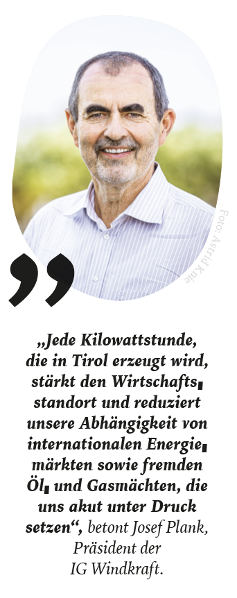 Derzeit überweist Tirol im Jahr rund eine Milliarde Euro für den Import fossiler Energie ins Ausland. Der Ausbau der Windkraft bietet die Möglichkeit, diese Abflüsse deutlich zu reduzieren und gleichzeitig Investitionen im eigenen Land zu halten. Allein die Realisierung der im österreichischen Netzinfrastrukturplan (ÖNIP) für Tirol vorgesehenen 30 Windräder, mit einer Windstromproduktion von 300 GWh bis 2030, brächte dem Land eine Investition von 255 Mio. Euro und einen Ertrag von 160 Mio. Euro in den ersten 20 Betriebsjahren. „Tirol hat mehrere wirklich gut geeignete Windkraft-Standorte und gleichzeitig können die sensiblen Regionen Tirols freigehalten werden“, bekräftigt Plank.