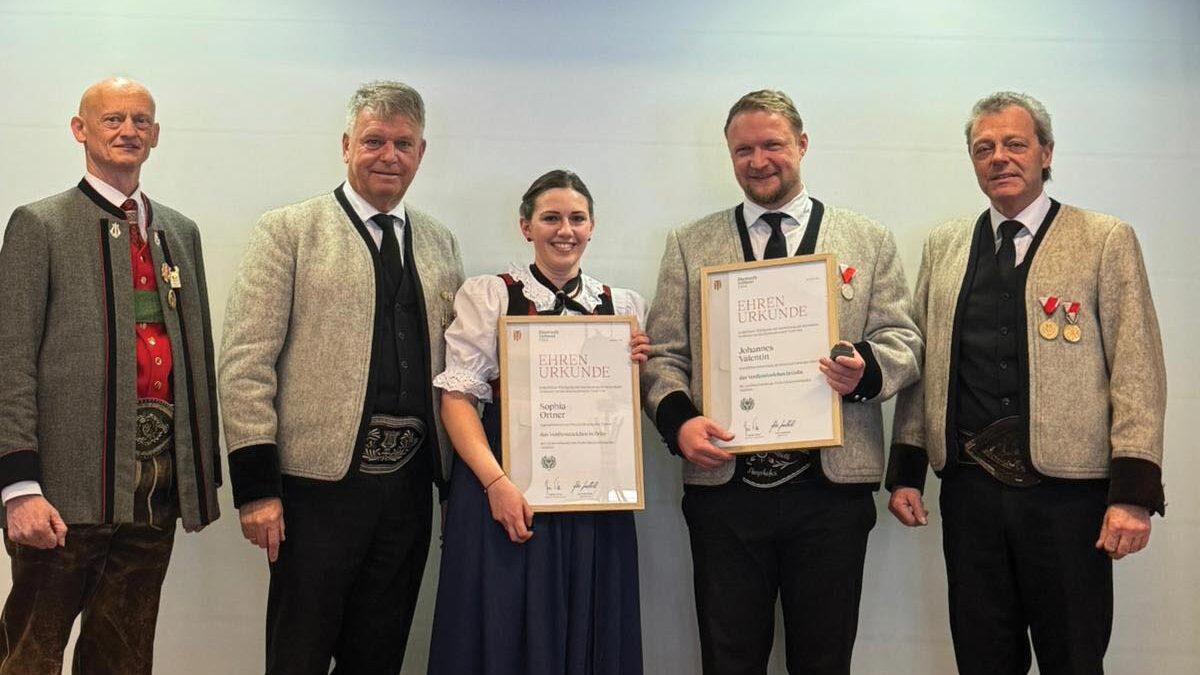Bezirks-Jugendreferentin Sophia Ortner (BMK Hart) und Bezirks-Schriftführer-Stv. Johannes Valentin (BMK Mayrhofen) erhielten seitens des Blasmusikverbandes Tirol das Verdienstzeichen in Grün für ihre jahrelange Tätigkeit in den Ausschüssen ihrer Musikkapellen sowie im Ausschuss des Blasmusikverbandes Zillertal.